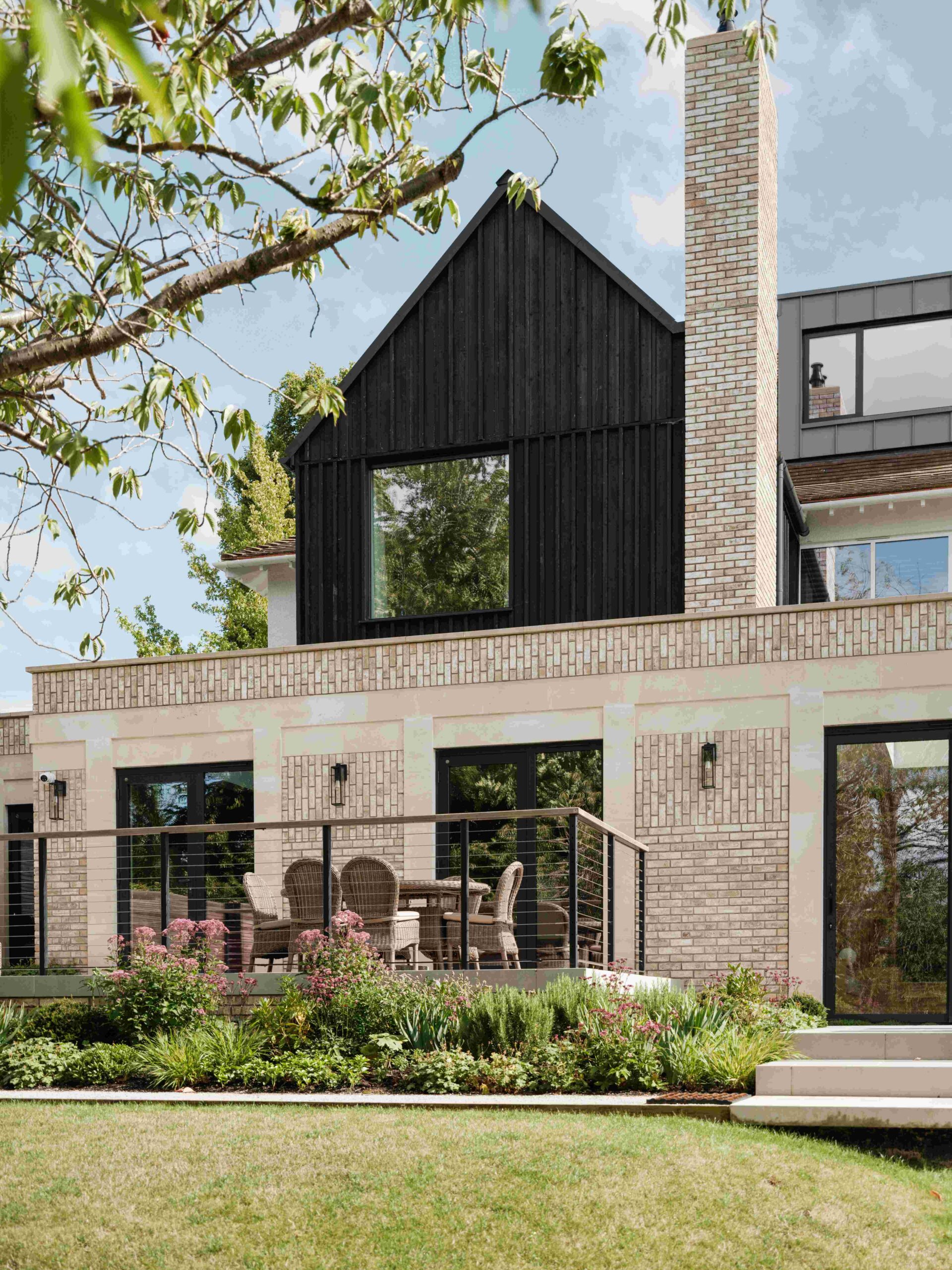 The charred larch (also known as the Japanese technique of su sugi ban) and zinc-clad gable is a contemporary interpretation of the Arts and Crafts half-timbered front gable.