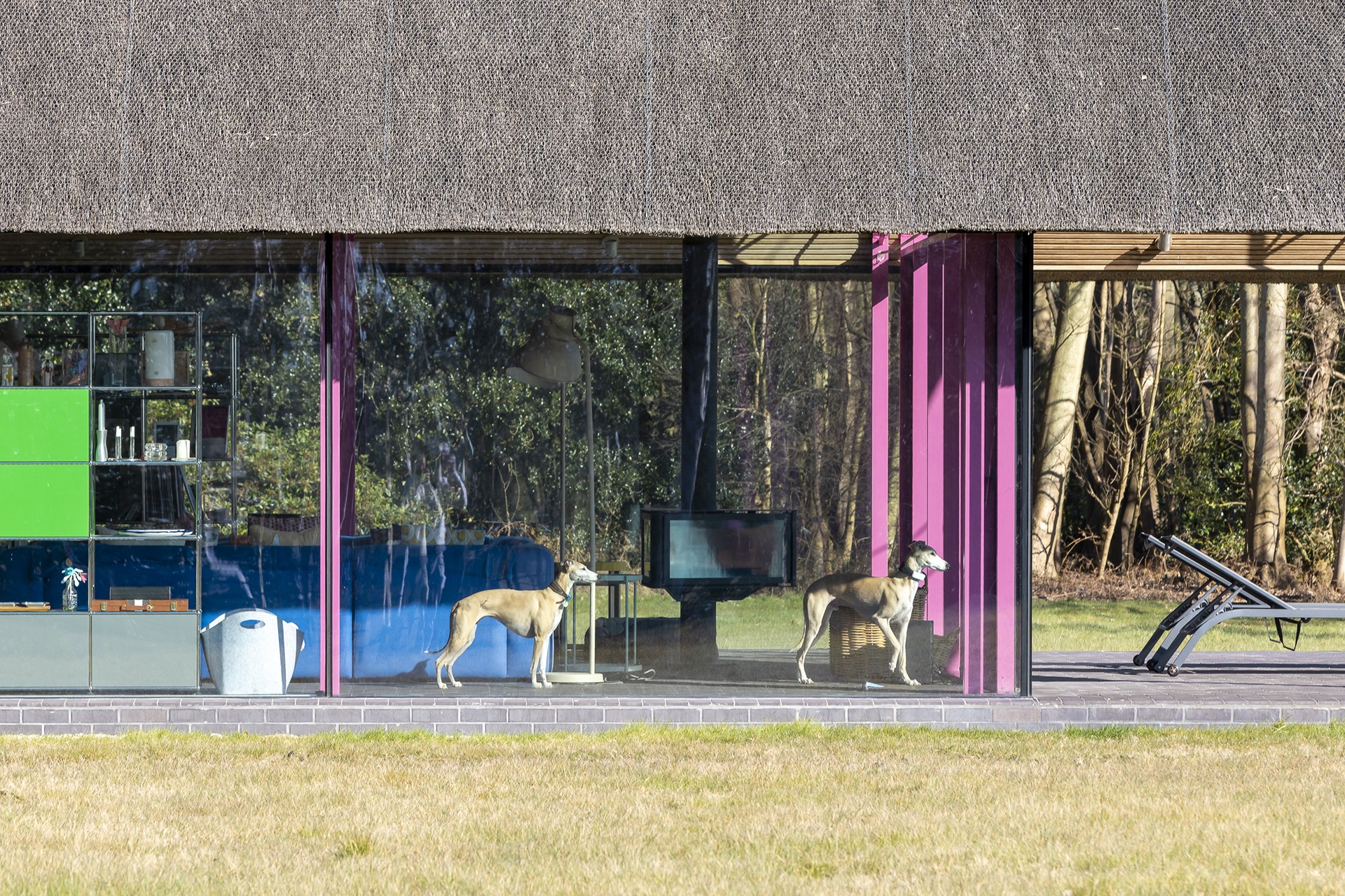 In the main living block a steel frame painted Suffolk pink (the colour of all those pretty, half-timbered cottages in the local area) and glass walls – hi tech elements the Hopkins senior would be proud of – are topped with a wonderfully incongruous deep thatched roof that almost appears to float above the ground.
